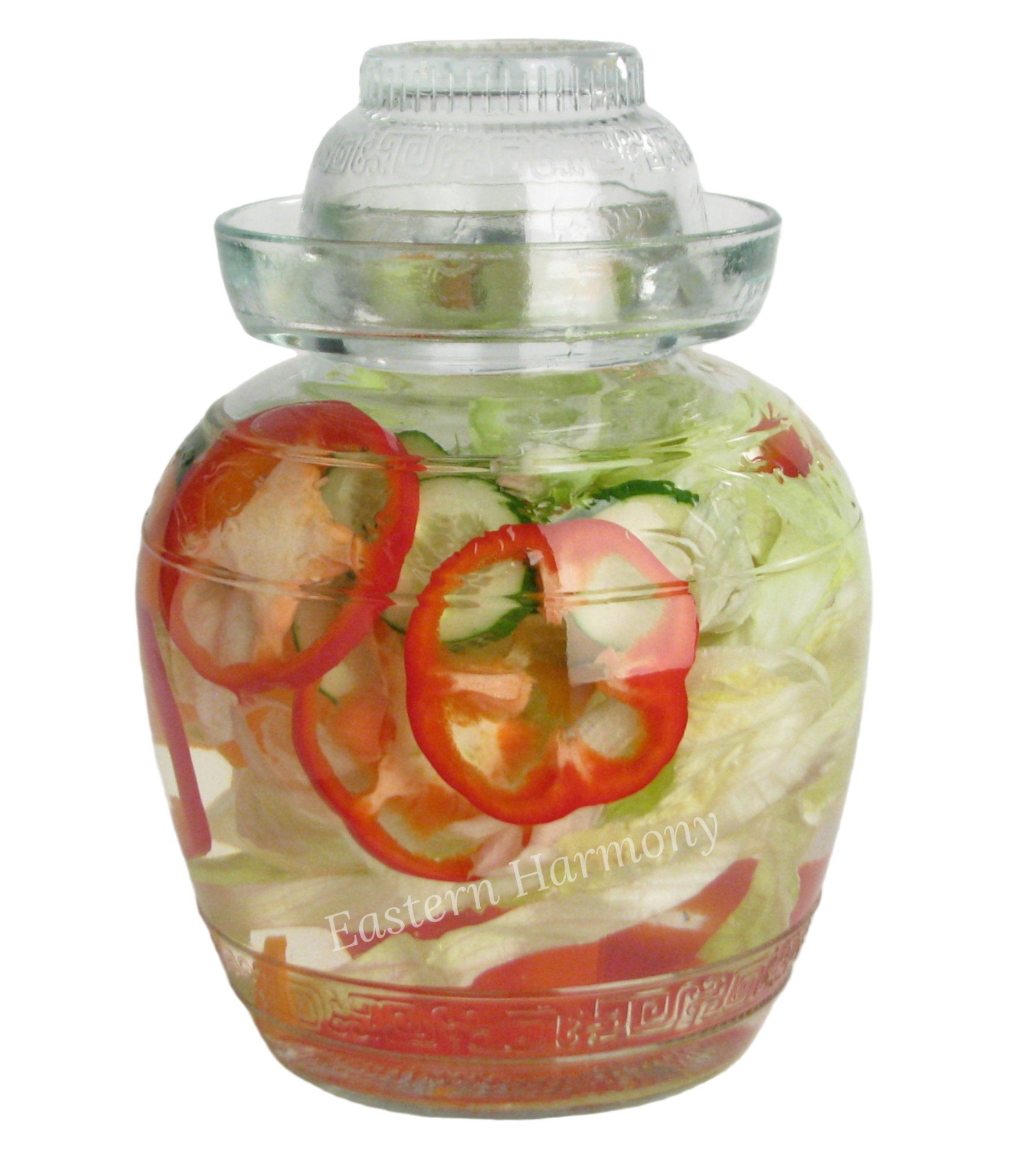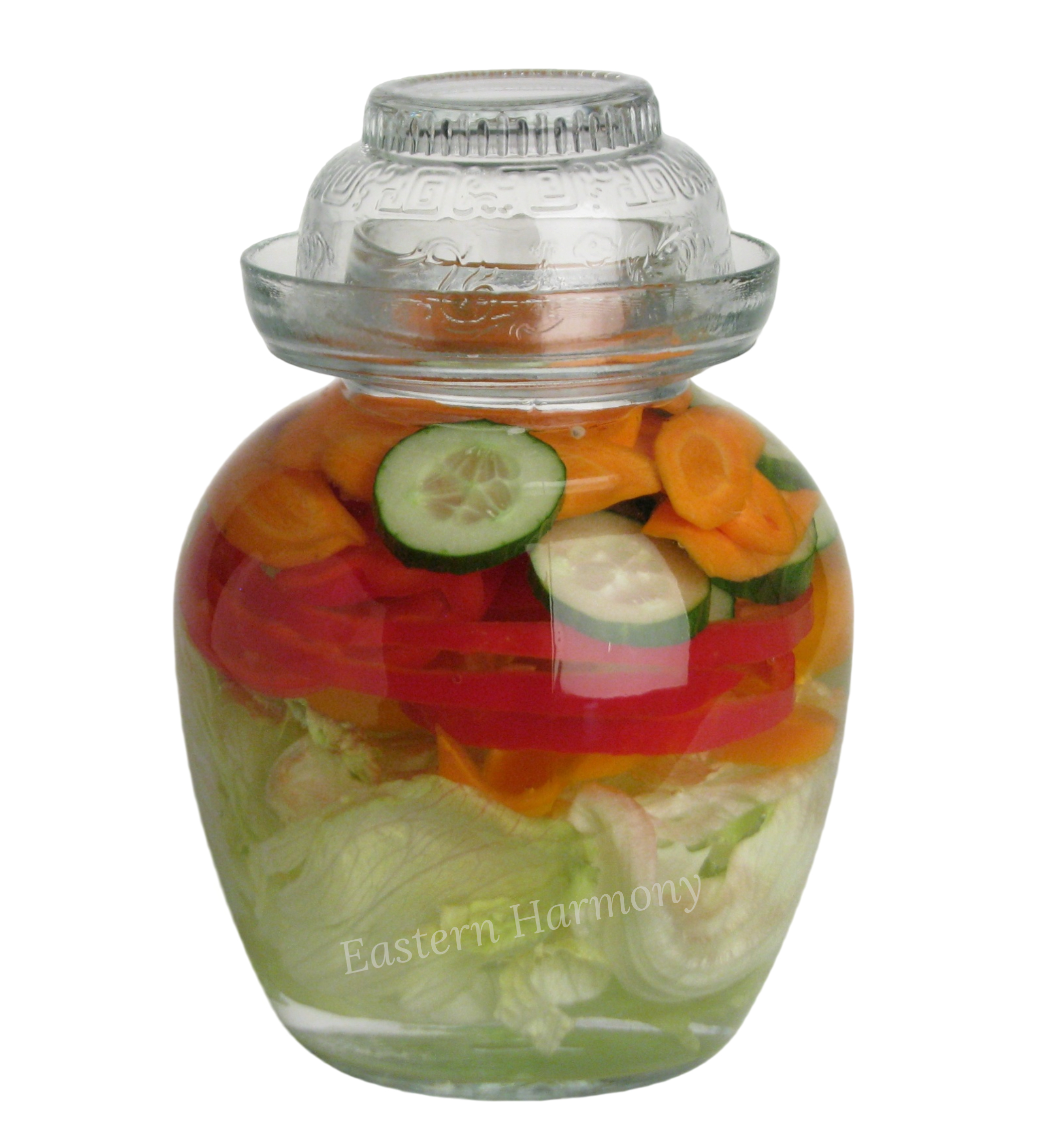 Fermenteringskruka av glas med lock, 2,5 – 4 liter. Den kan användas till att fermentera kimchi, gurka, surkål eller frukt.